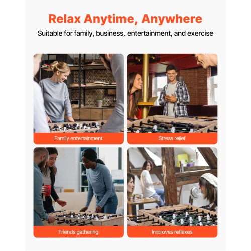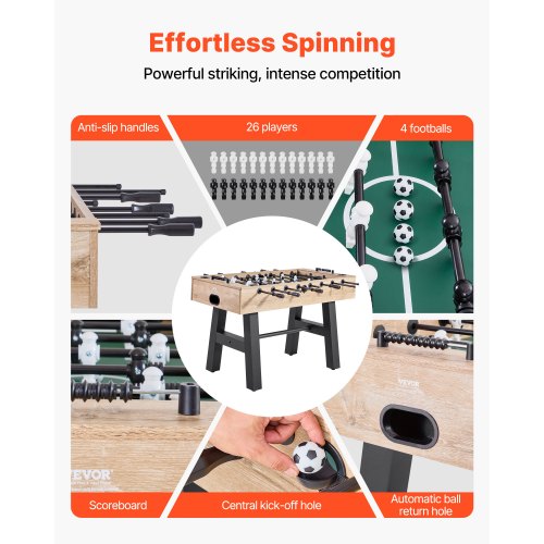 Robust och hållbart: Det 55-tums fotbollsbordet är tillverkat av slitstark fiberplatta med medeldensitet. Det har plats för 26 spelare och 4 fotbollar. Stavarna är raka och släta, vilket säkerställer kraftfulla slag utan att böjas eller rosta.