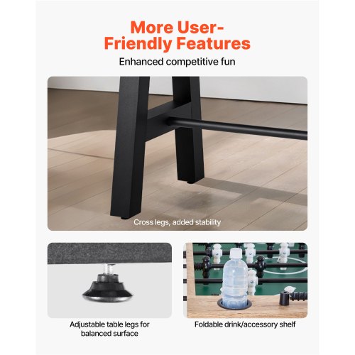 Smidig bollrörelse: Fotbollsbordets bekväma höjd passar de flesta. Förlängda ben säkerställer bordets stabilitet, och du kan justera dessa ben för att bibehålla en balanserad spelyta för mer exakt bollkontroll.