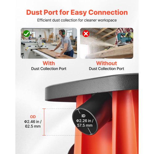 Dammfri drift: Utrustad med en dammport på 57,5 mm innerdiameter och 62,5 mm ytterdiameter, ansluts vår spindelslip enkelt till dammslangar för effektiv dammuppsamling, vilket minskar rengöringen och håller din arbetsyta renare.