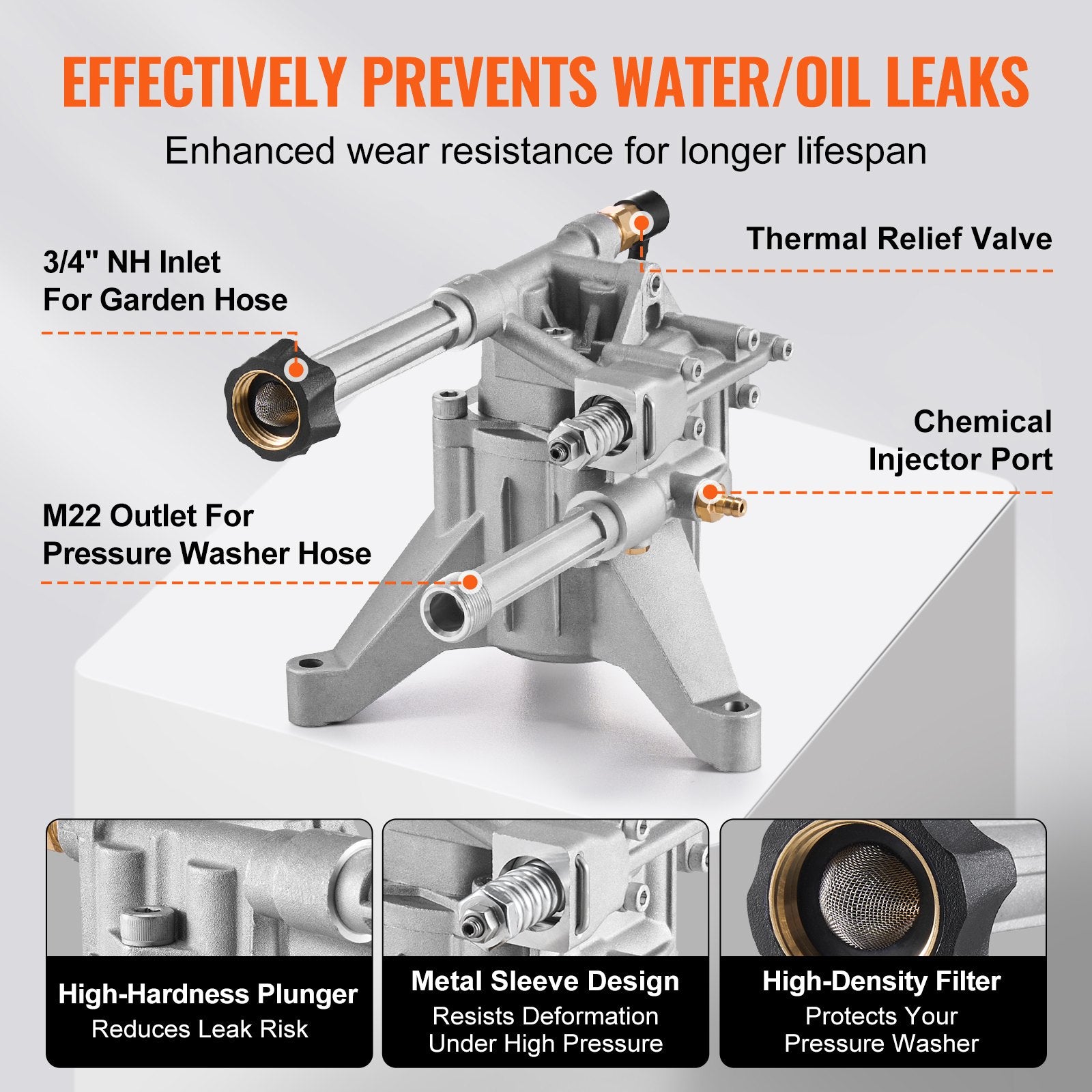 Underhållsfri design: Denna ersättningspump för motortvätt har ett underhållsfritt vevhus, vilket eliminerar behovet av oljebyten. Idealisk för 2500-3000 PSI och 2,5 GPM elektriska tvättmaskiner, den är perfekt för rengöring av väggar, staket, trottoarer, fordon och mer.